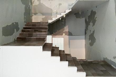 Basen i utställningen är den flagnande färgen som, för inte så länge sedan, låg nerfallen på trappstegen. Nu hänger flagorna fastlimmade i fisklinor nedtyngda av glaskulor i mellanrummet i mitten av trappen. Den negativa ytan på väggen har markerats av självlysande färg, det är där du hittar bl.a. Borås och Danmark. Strålkastare i trappen slår på med ett intervall av 6 minuter. När de inte är på och utrymmet är mörkt så lyser väggens världskarta av neon. I rummet så hörs också en uppläsning som går på rundgång och sakta förvandlas till endast rummets resonans.
